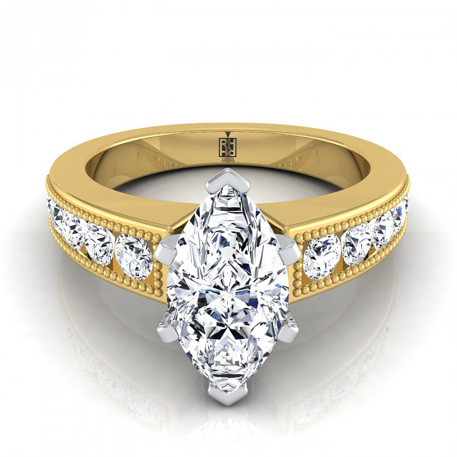 V-tip prongs and bezel settings are the best for marquise diamonds. Yet you need to select settings that offer a V-claw that fully covers and protects both tips of the gem for maximum protection of it. This may eliminate ring style choices, such as a tension set marquise diamond ring.