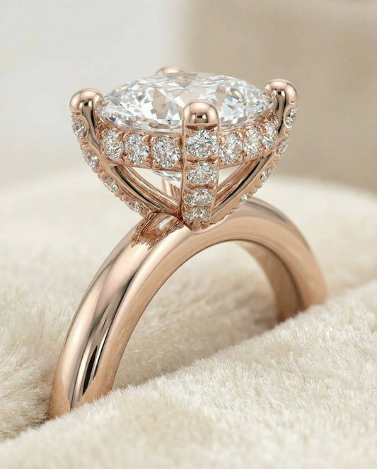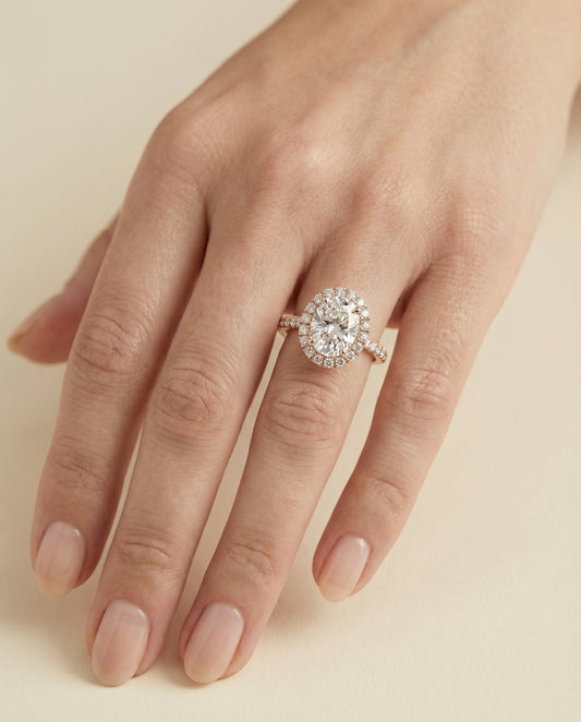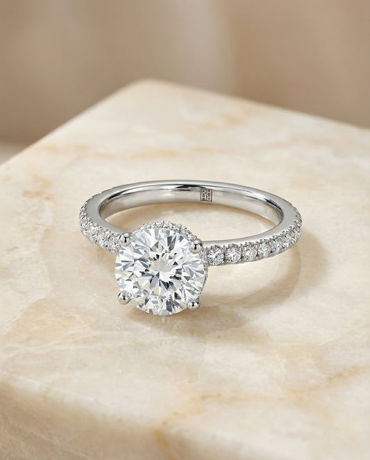 Every RockHer Select style is available in multiple metals and carat weights — each one a complete ring with setting and diamond priced together. Styles span halo designs, pavé settings, solitaires, and more. New styles are added to this collection on an ongoing basis.