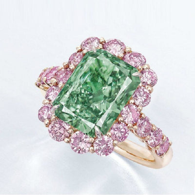 At RockHer we specialize in setting green diamonds to maximize their impact. Contrasting a green diamond center gem with a colorless diamond halo or pink diamonds can provide contrast to set off the color of a green diamond center stone.