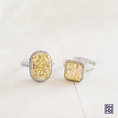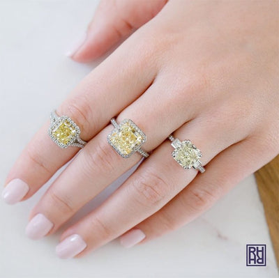 The contrast effect means that halo yellow diamond halo engagement rings are a popular choice. Three-stone engagement rings with a yellow diamond center stone and white diamond side stones are another way to add contrast and make the color of your yellow diamond look richer.