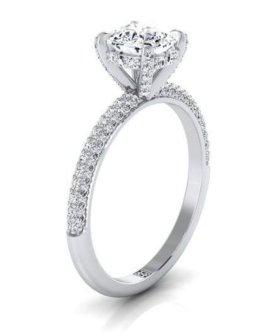 Our customers’ favorite setting for cushion cut engagement rings is simple cushion cut diamond solitaire with a delicate pave band. Delicate micropave halo cushion engagement rings are also popular. Meghan Markle’s three stone cushion cut engagement ring with two round brilliant diamonds on the sides has made this classic combination fashionable again.