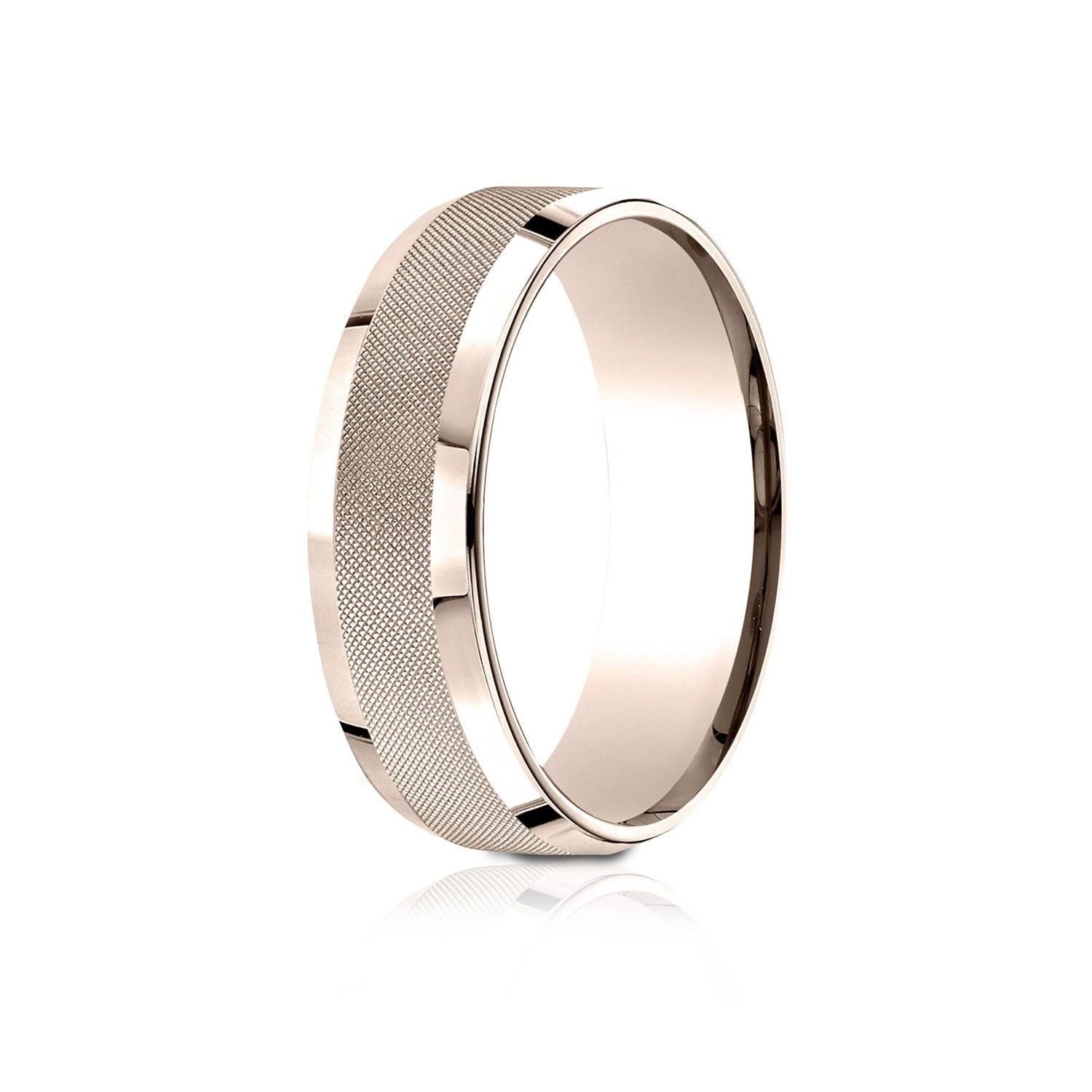 This Refined 14 Karat Rose Gold 7mm Comfort-fit Carved Design Band Features An Intricate Cross Hatch Pattern Center Framed By High Polish Round Edges.