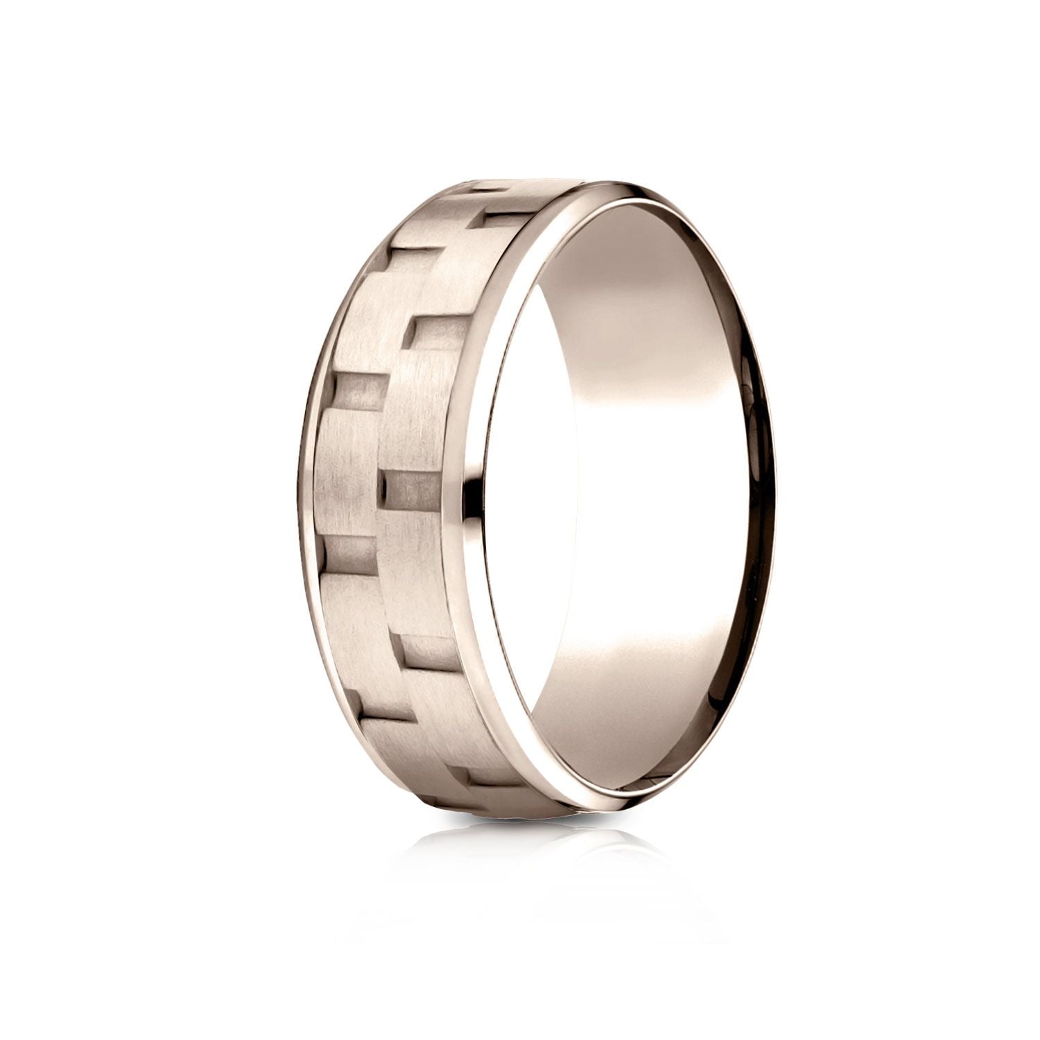 This Timeless 14 Karat Rose Gold 8mm Design Band Features Our Unique Sandblasted Satin Finish Over A Chain Link Design And High Polish Edge.