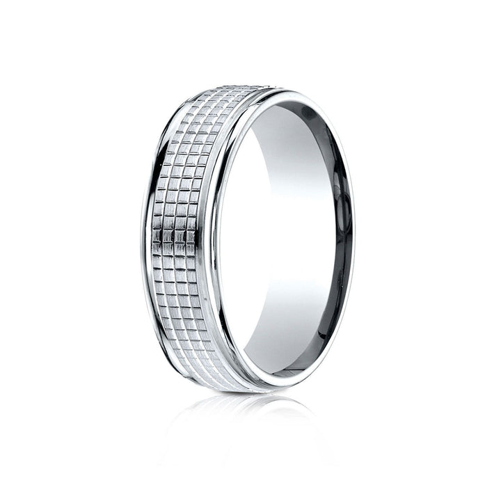 This Refined 14 Karat White Gold 7mm Comfort-fit Carved Design Band Features An Intricate Cross Hatch Pattern Center Framed By High Polish Round Edges.