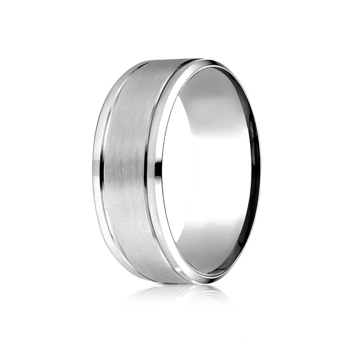This Timeless 14 Karat White Gold 8mm Design Band Features A Satin Finish Framed By High Polish Edges.