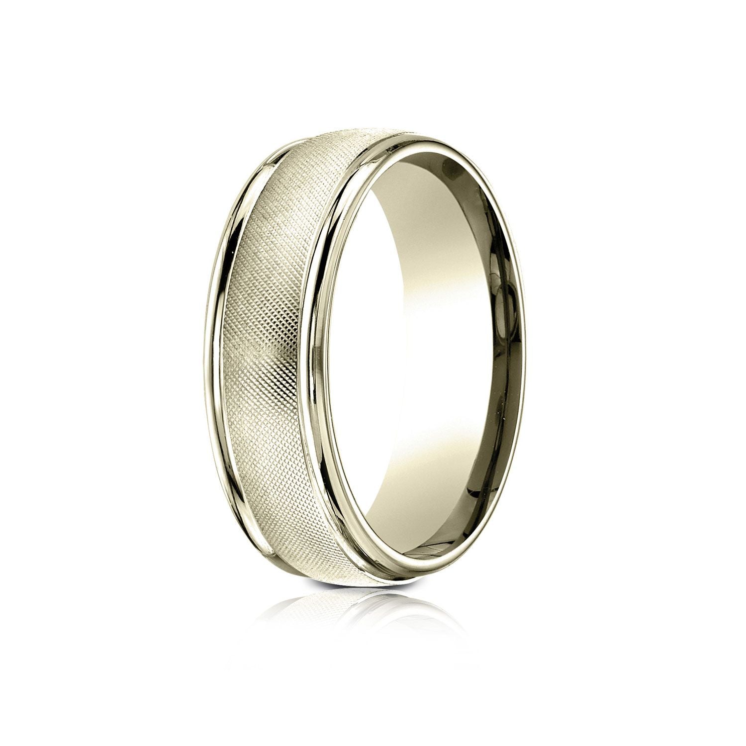 This Stylish 14 Karat Yellow Gold 7mm Comfort-fit Carved Design Band Features A Florentine Finish Center Framed By High Polish Round Edges.