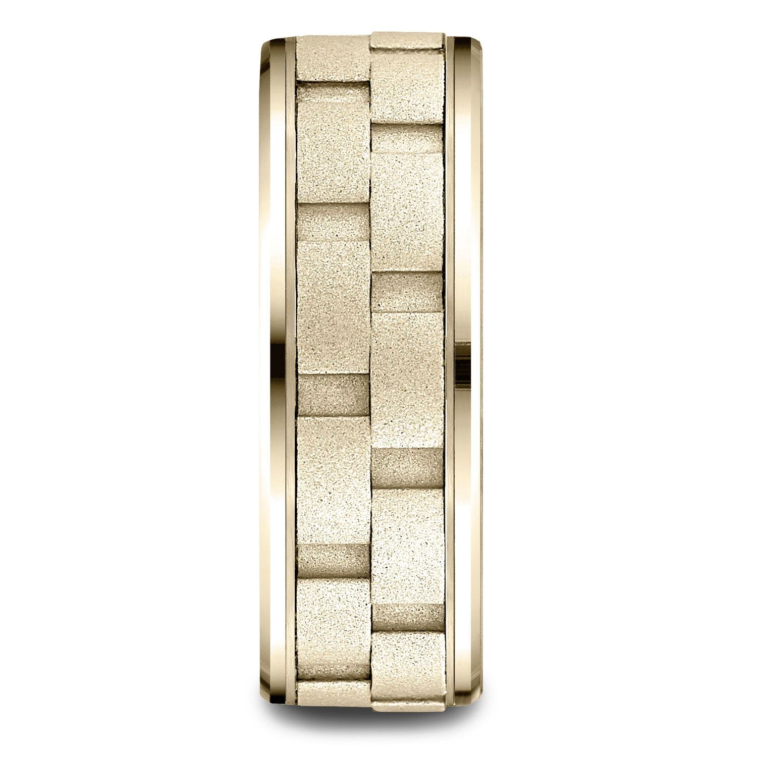 This Timeless 14 Karat Yellow Gold 8mm Design Band Features Our Unique Sandblasted Satin Finish Over A Chain Link Design And High Polish Edge.