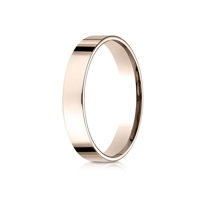 This Beautiful 14 Karat Rose Gold 4mm Band Features A Flat Surface For A More Modern Look. It Also Features A Comfort-fit On The Inside For Unforgettable Comfort.