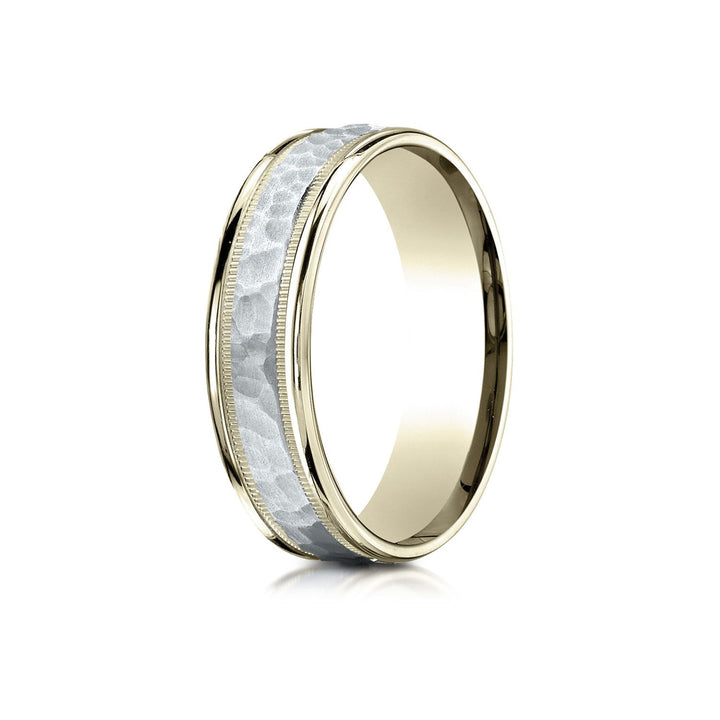 This Incredible 14 Karat Gold Two-tone 6mm Carved Design Band Features A Hammered-finished 14 Karat White Along The Center With 14 Karat Yellow And Milgrain Along The High Polished Edge.