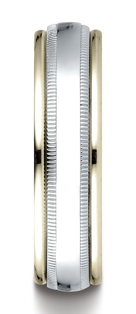 This Beautiful 14 Karat Gold Two-tone 6mm Comfort-fit Carved Design Band Features A 14 Karat White Gold High Polished Center With Milgrain And An 14 Karat Yellow High Polished Edge.