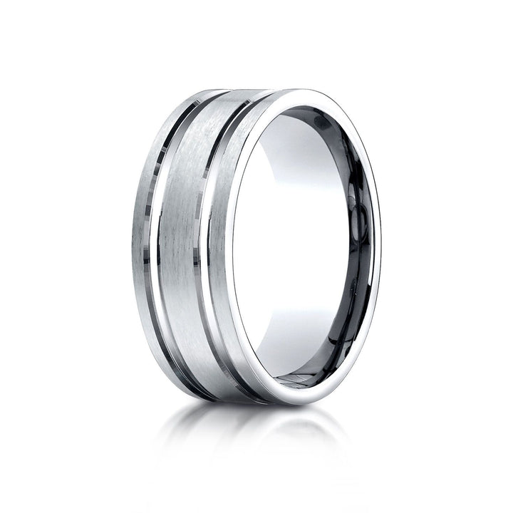 This Incredible 14 Karat White 8mm Comfort-fit Satin-finished Carved Design Band Features Two High Polished Parallel Center Grooves For A Continuous Flow Of Style.