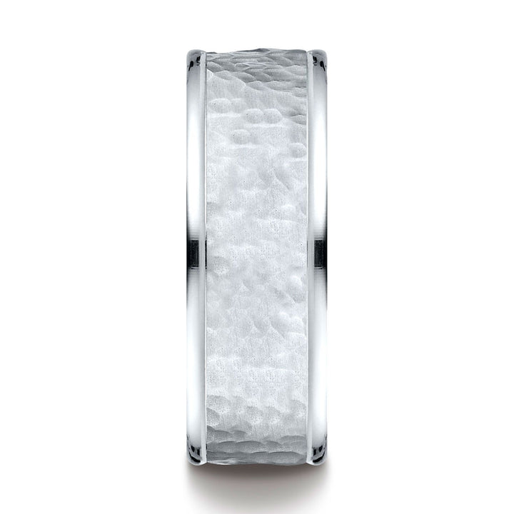 14k White Gold Comfort Fit 8mm High Polish Edge Hammered Center Design Band
