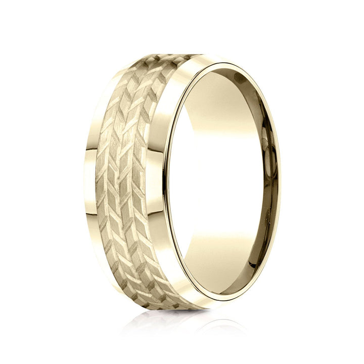 14k Yellow Gold 8mm Comfort Fit Beveled Edge Treaded Design Band