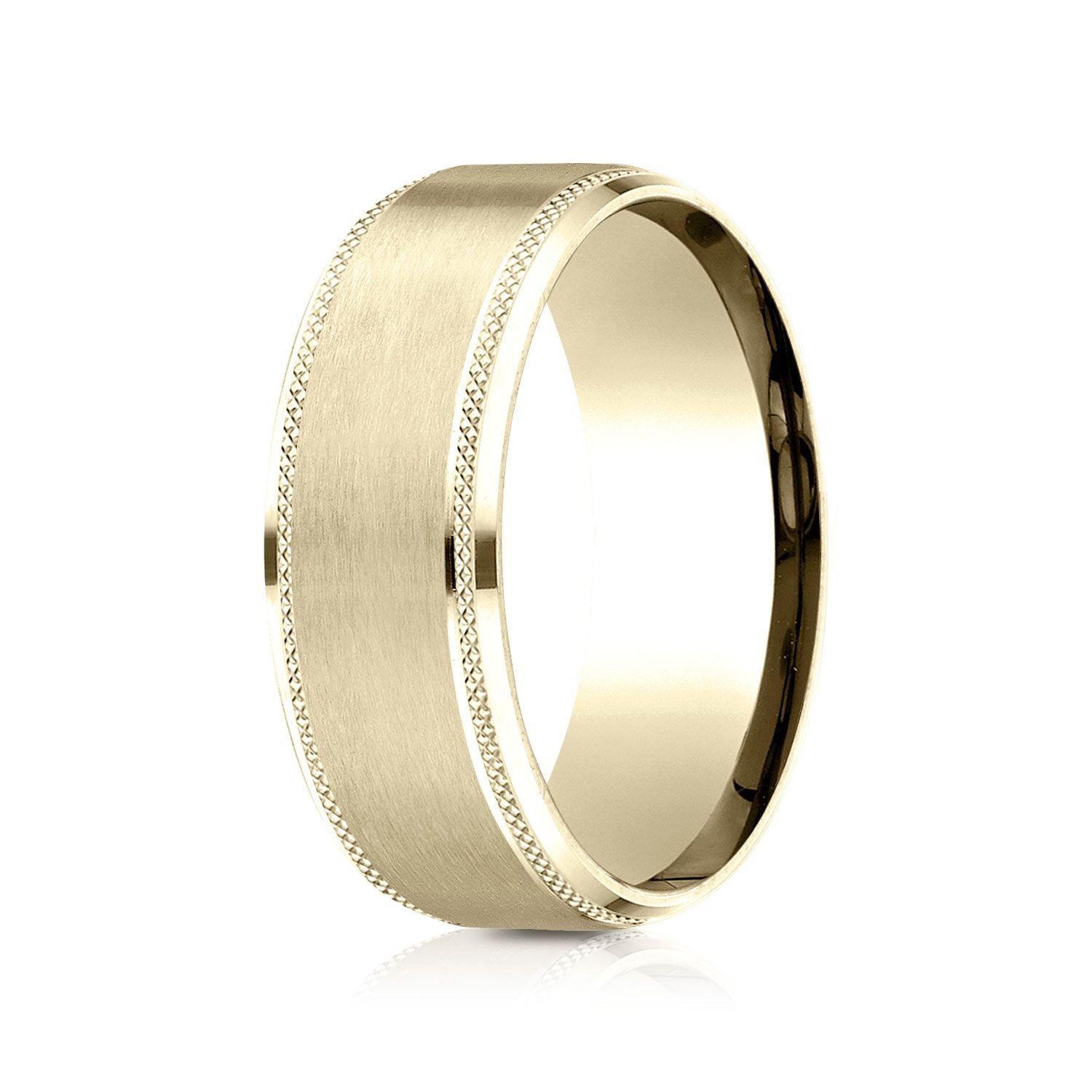 14k Yellow Gold 8mm Comfort Fit Knurled Drop Bevel Satin Finish Design Band