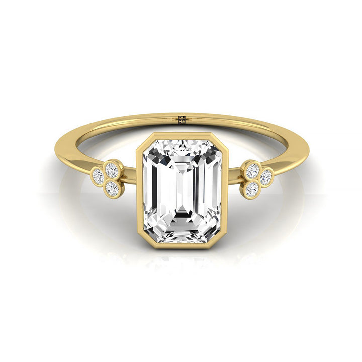 14ky Bezel Set Emerald Engagement Ring With 6 Clover Bezel Set Round Diamonds On Shank