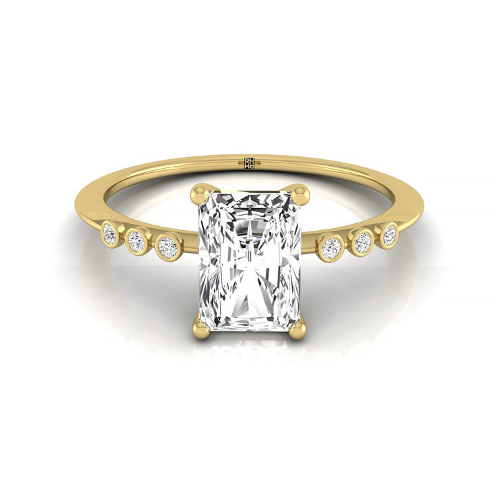 14ky Radiant Engagement Ring With 6 Bezel Set Round Diamonds On Shank