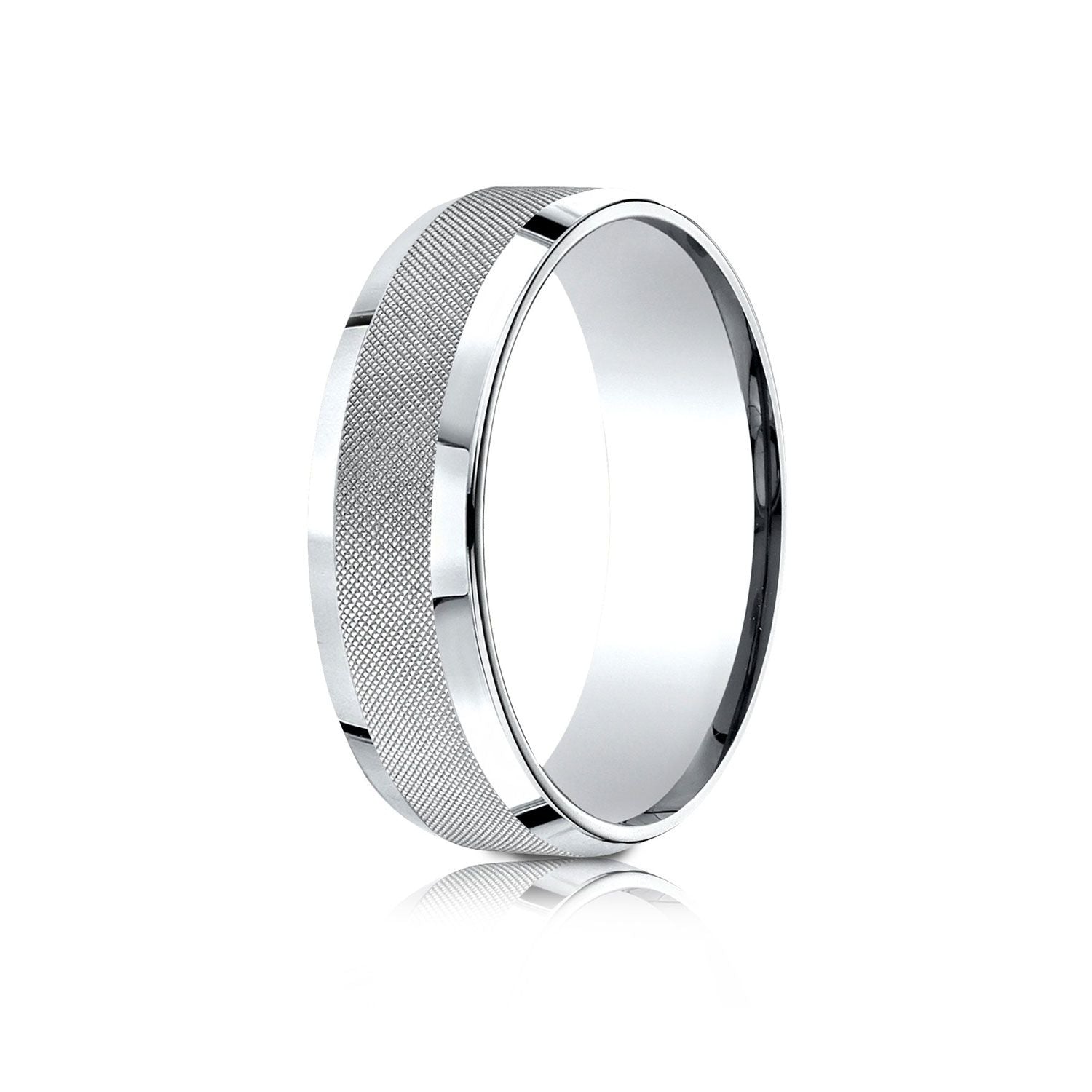 This Refined 18 Karat White Gold 7mm Comfort-fit Carved Design Band Features An Intricate Cross Hatch Pattern Center Framed By High Polish Round Edges.