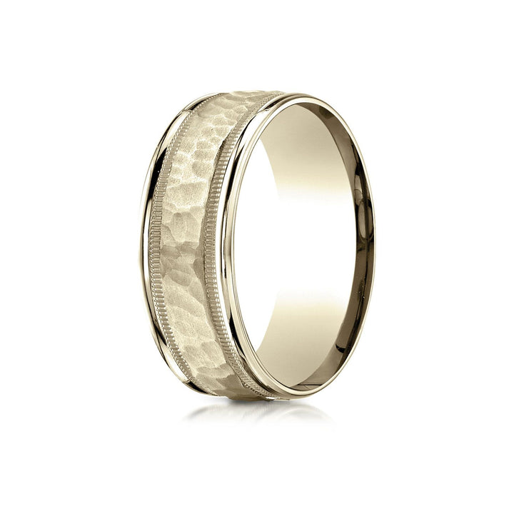 18 Karat Yellow Gold 8mm Comfort-fit Hammered Center High Polish Round Edge Carved Design Band