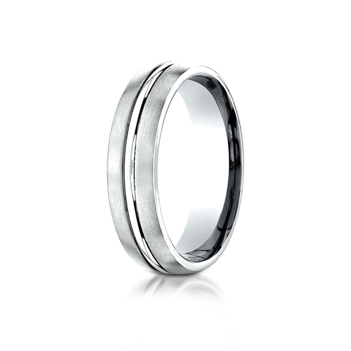 This 18 Karat White 6mm Comfort-fit Satin-finished Carved Design Band Features A High Polished Cut Along The Center.