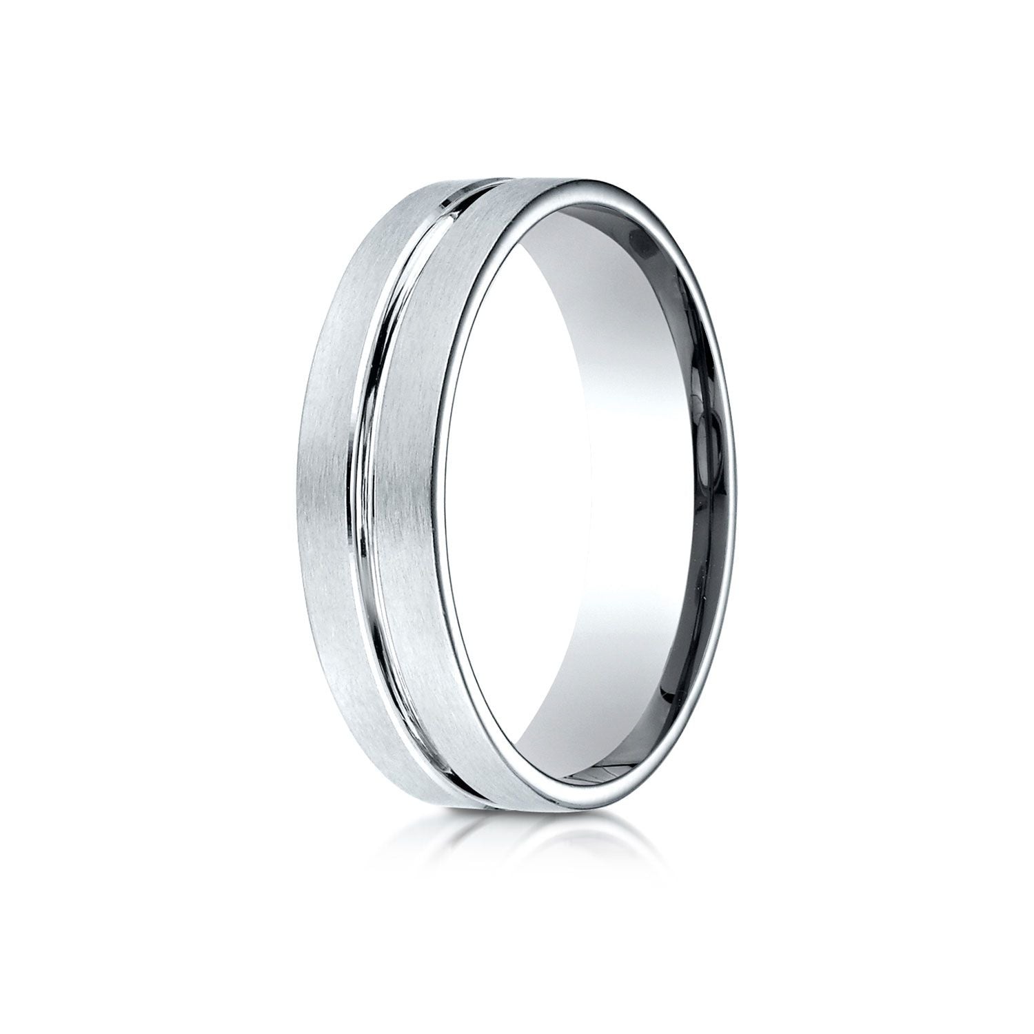 18k White Gold 6mm Comfort-fit Satin-finished With High Polished Center Cut Carved Design Band