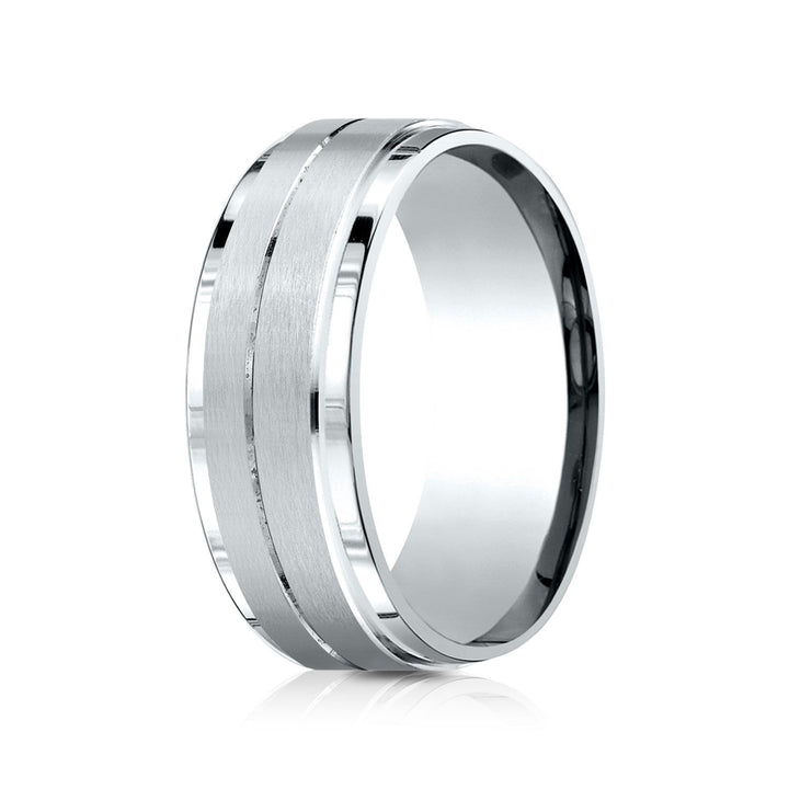 18k White Gold 8mm Comfort Fit Drop Bevel Satin Finish Center Design Band
