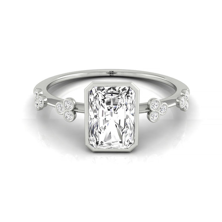 18kw Bezel Set Radiant Engagement Ring With 12 Clover Bezel Set Round Diamonds On Shank
