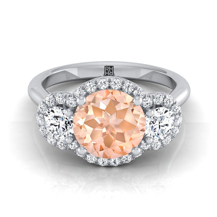 18K White Gold Round Brilliant Morganite French Pave Diamond Three Stone Engagement Ring -1/2ctw