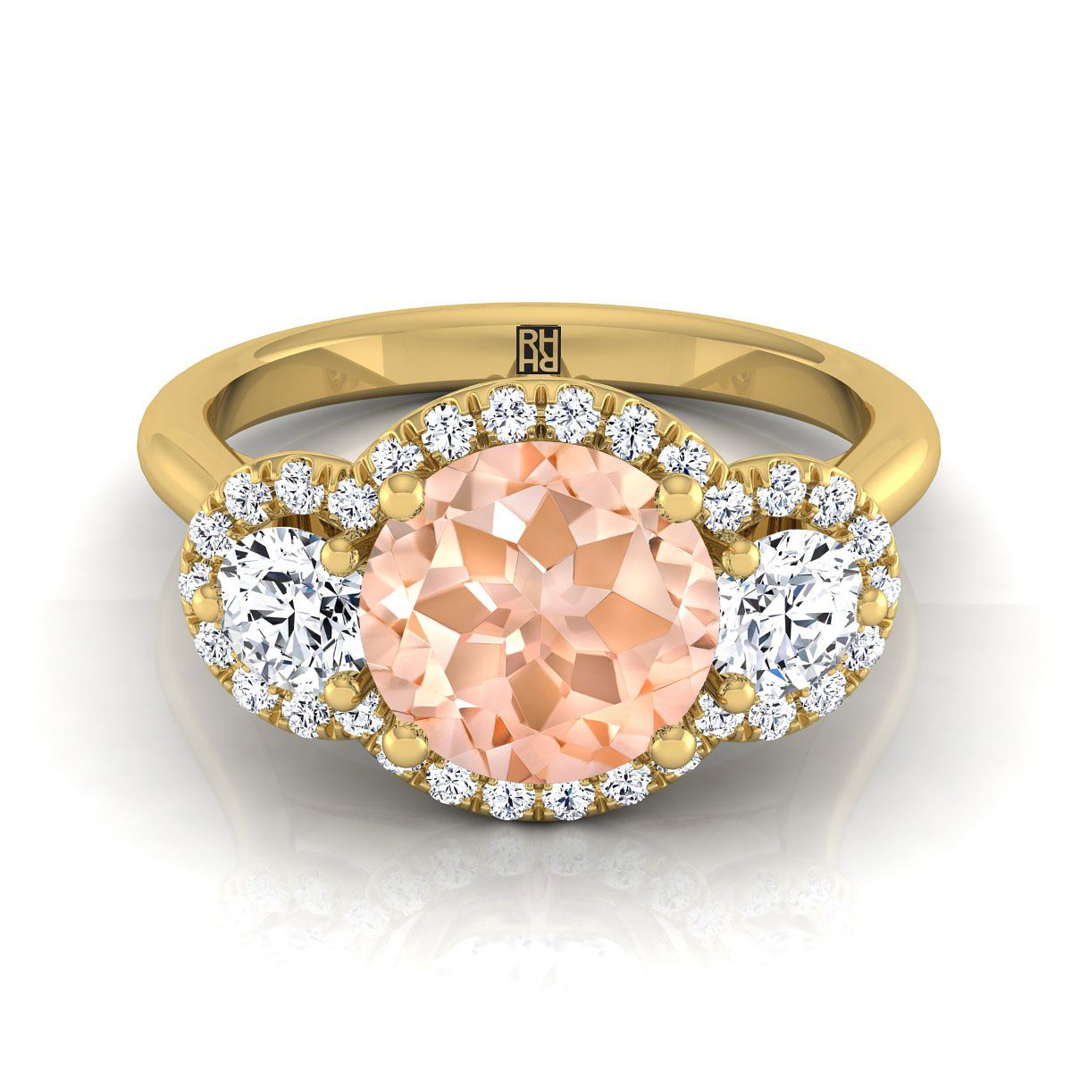 18k Yellow Gold Engagement Ring With 5 Mm Round Morganite Center Stone And 34 Round Brilliant Diamonds Weighing 0.50ctw