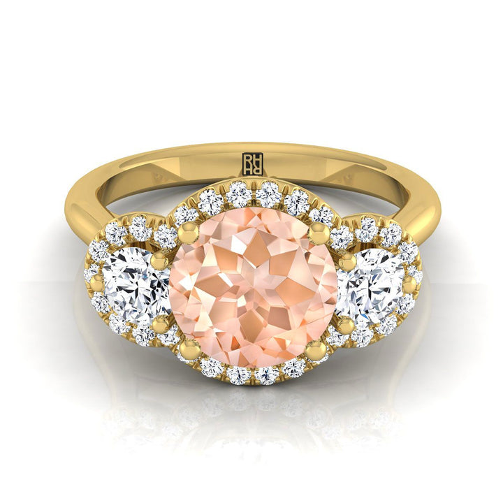 18K Yellow Gold Round Brilliant Morganite French Pave Diamond Three Stone Engagement Ring -1/2ctw
