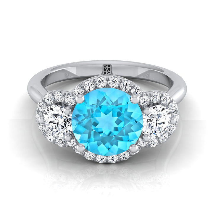 18K White Gold Round Brilliant Swiss Blue Topaz French Pave Diamond Three Stone Engagement Ring -1/2ctw