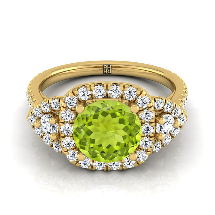 18K Yellow Gold Round Brilliant Peridot Delicate Three Stone Halo Pave Diamond Engagement Ring -5/8ctw