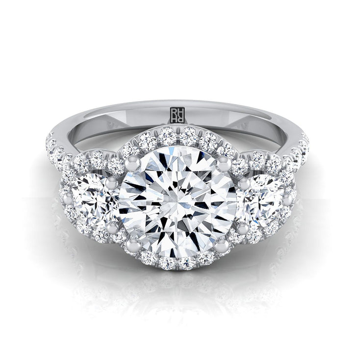 14K White Gold Round Brilliant Diamond Timeless Three Stone Halo with French Engagement Ring -3/4ctw
