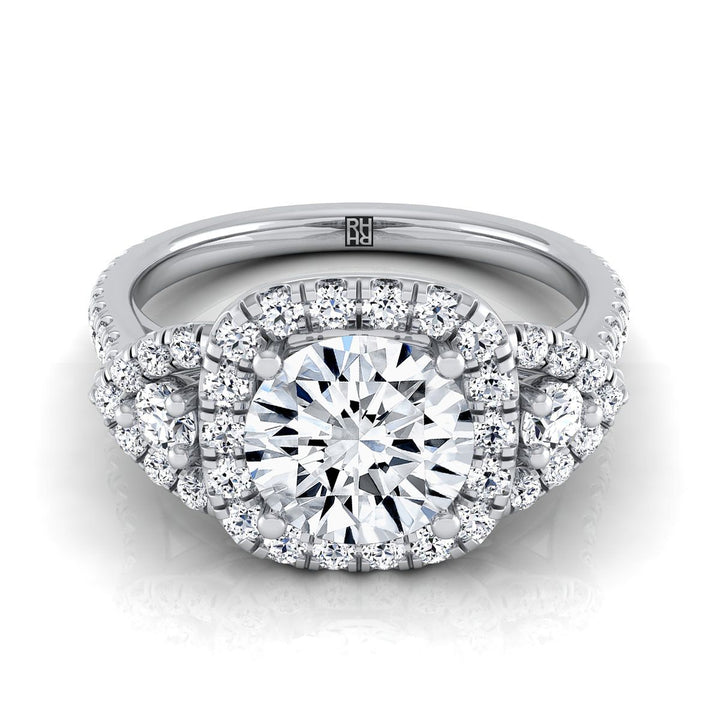 Platinum Round Brilliant Diamond Delicate Three Stone Halo Pave Engagement Ring -5/8ctw