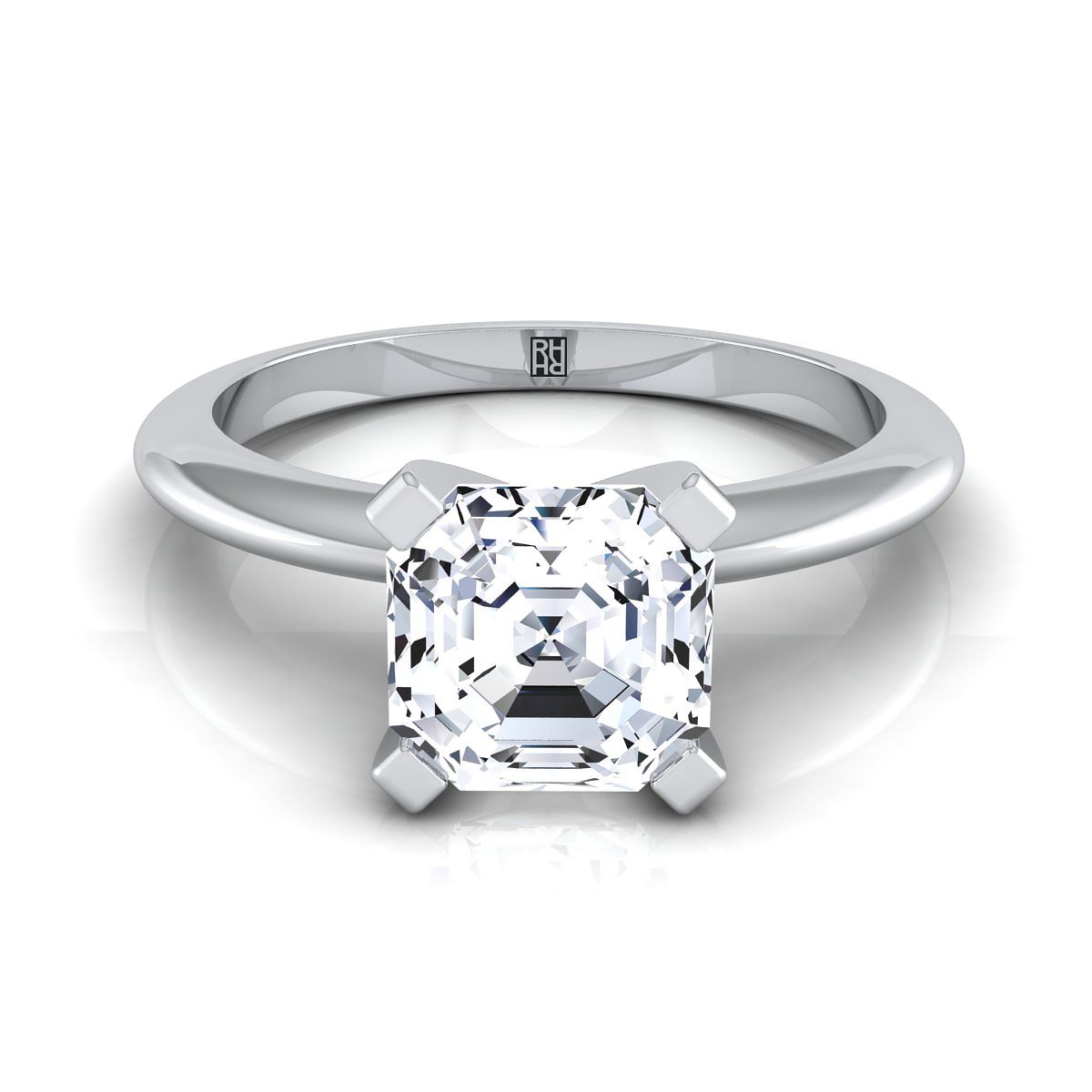A Classic Statement Of Style, This Asscher Cut Solitaire Engagement Ring Showcases A Modern Knife Edge Shank And 4 Prong Center Setting In 14k White Gold