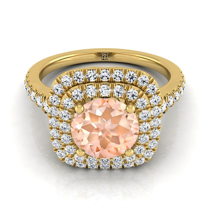 18K Yellow Gold Round Brilliant Morganite Double Halo with Scalloped Pavé Diamond Engagement Ring -1/2ctw