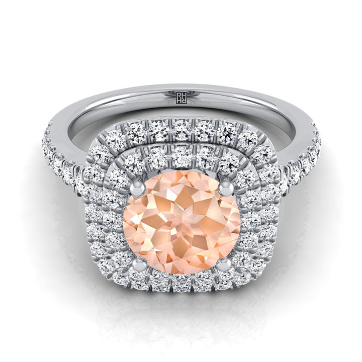 Platinum Round Brilliant Morganite Double Halo with Scalloped Pavé Diamond Engagement Ring -1/2ctw