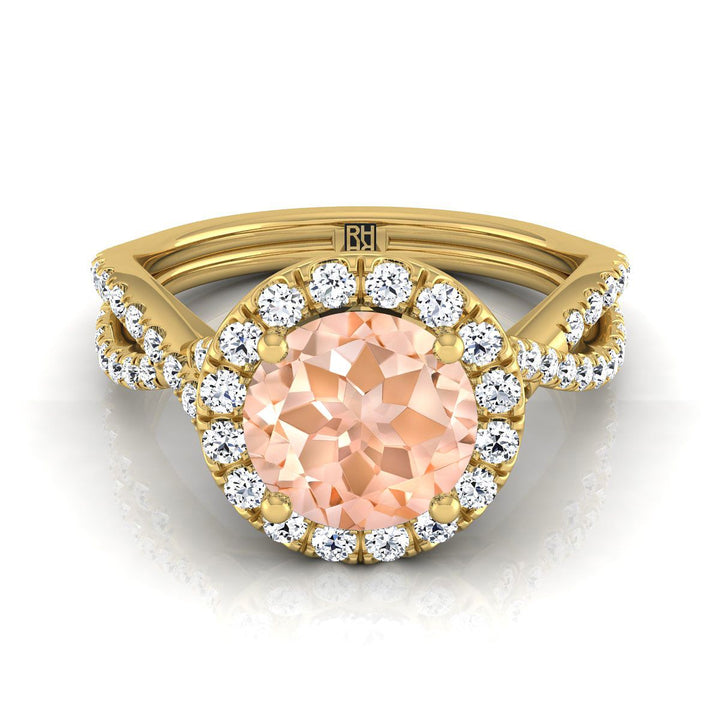 18K Yellow Gold Round Brilliant Morganite  Twisted Scalloped Pavé Diamonds Halo Engagement Ring -1/2ctw