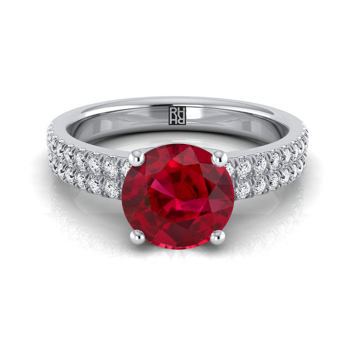 14K White Gold Round Brilliant Ruby Double Pave Diamond Row Engagement Ring -1/4ctw