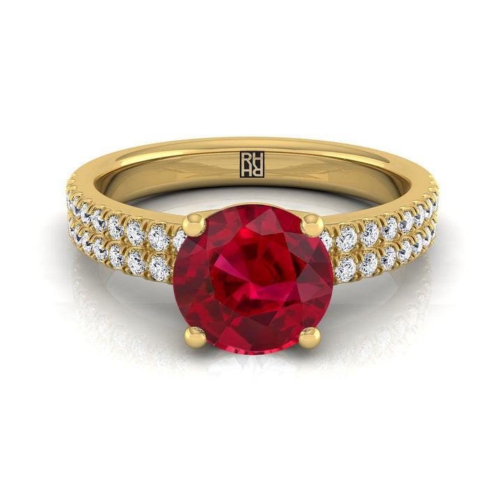 18K Yellow Gold Round Brilliant Ruby Double Pave Diamond Row Engagement Ring -1/4ctw