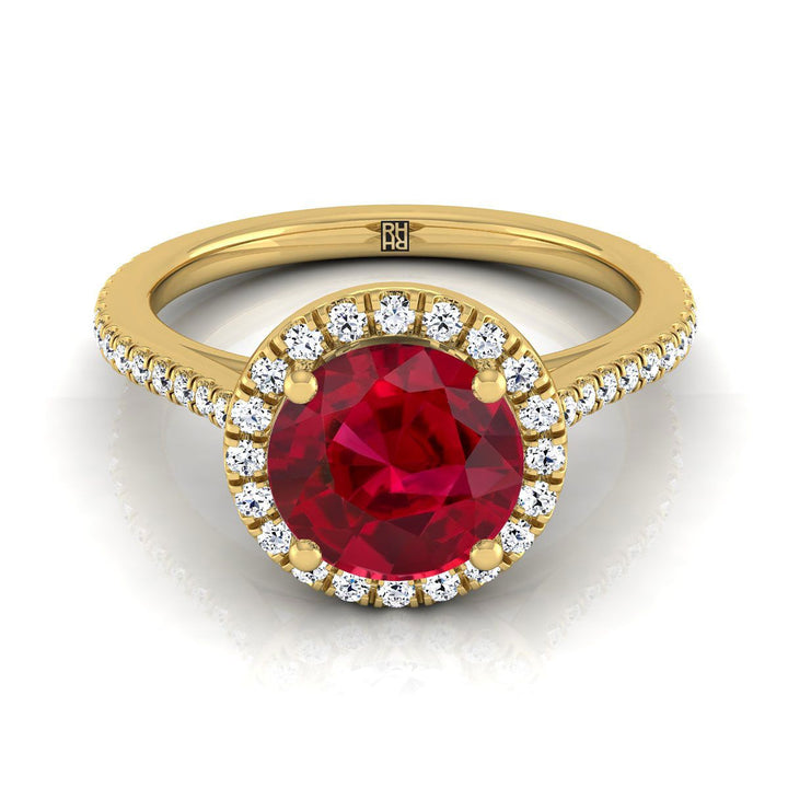 14k Yellow Gold Engagement Ring With 5mm Round Ruby Center Stone And 50 Round Brilliant Diamonds Weighing 0.25ctw