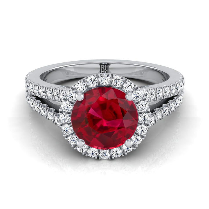 14K White Gold Round Brilliant Ruby Halo Center with French Pave Split Shank Engagement Ring -3/8ctw