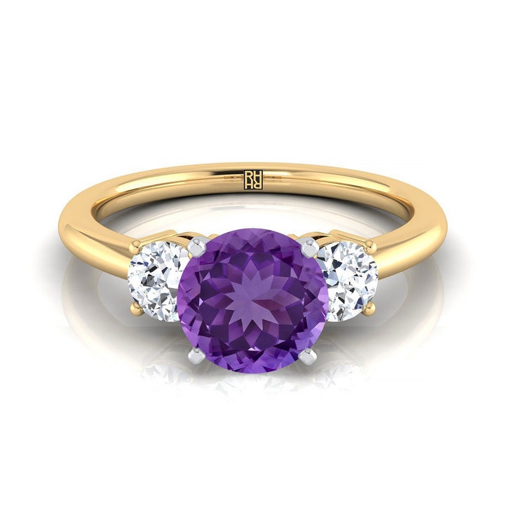 18K Yellow Gold Round Brilliant Amethyst Perfectly Matched Round Three Stone Diamond Engagement Ring -1/4ctw