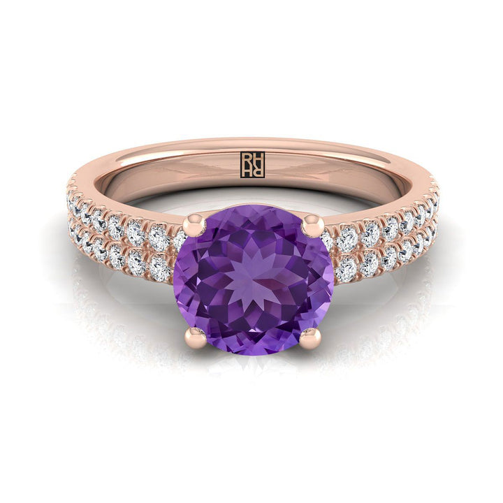 14K Rose Gold Round Brilliant Amethyst Double Pave Diamond Row Engagement Ring -1/4ctw