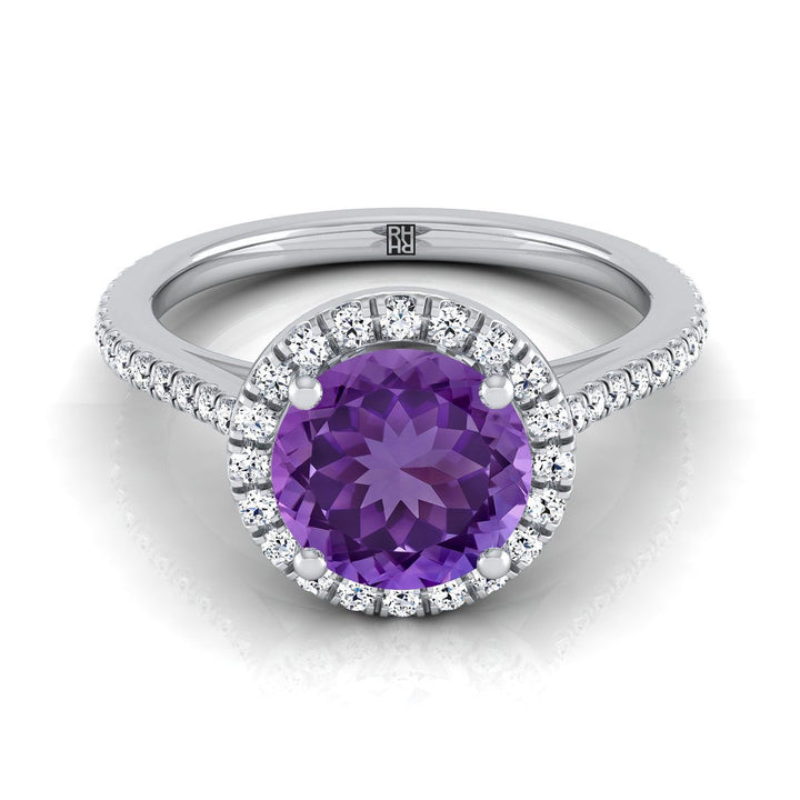 18k White Gold Engagement Ring With 6 Mm Round Amethyst Center Stone And 50 Round Brilliant Diamonds Weighing 0.25ctw