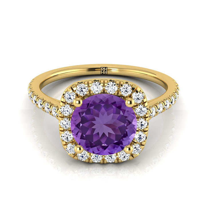18K Yellow Gold Round Brilliant Amethyst Halo Diamond Pave Engagement Ring -1/3ctw