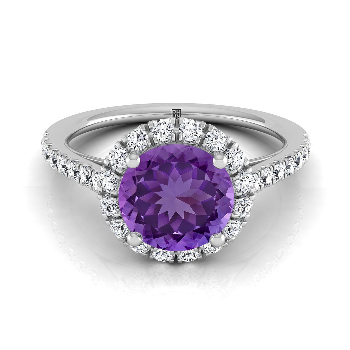 18K White Gold Round Brilliant Amethyst Petite Halo French Diamond Pave Engagement Ring -3/8ctw