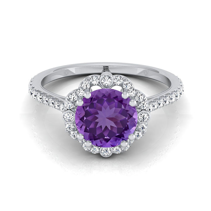 18k White Gold Engagement Ring With 6 Mm Round Amethyst Center Stone And 12 Round Brilliant Diamonds Weighing 0.10ctw