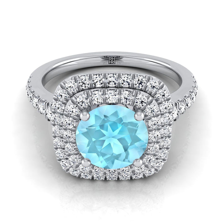 14K White Gold Round Brilliant Aquamarine Double Halo with Scalloped Pavé Diamond Engagement Ring -1/2ctw