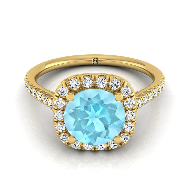 14K Yellow Gold Round Brilliant Aquamarine Simple Prong Set Halo Engagement Ring -1/3ctw