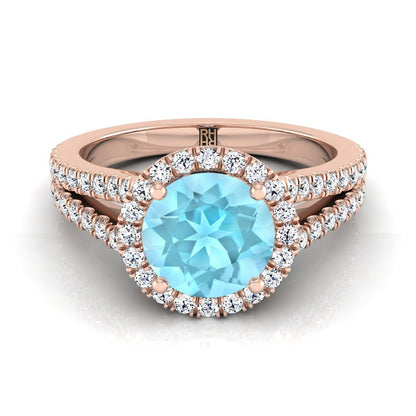 14K Rose Gold Round Brilliant Aquamarine Halo Center with French Pave Split Shank Engagement Ring -3/8ctw